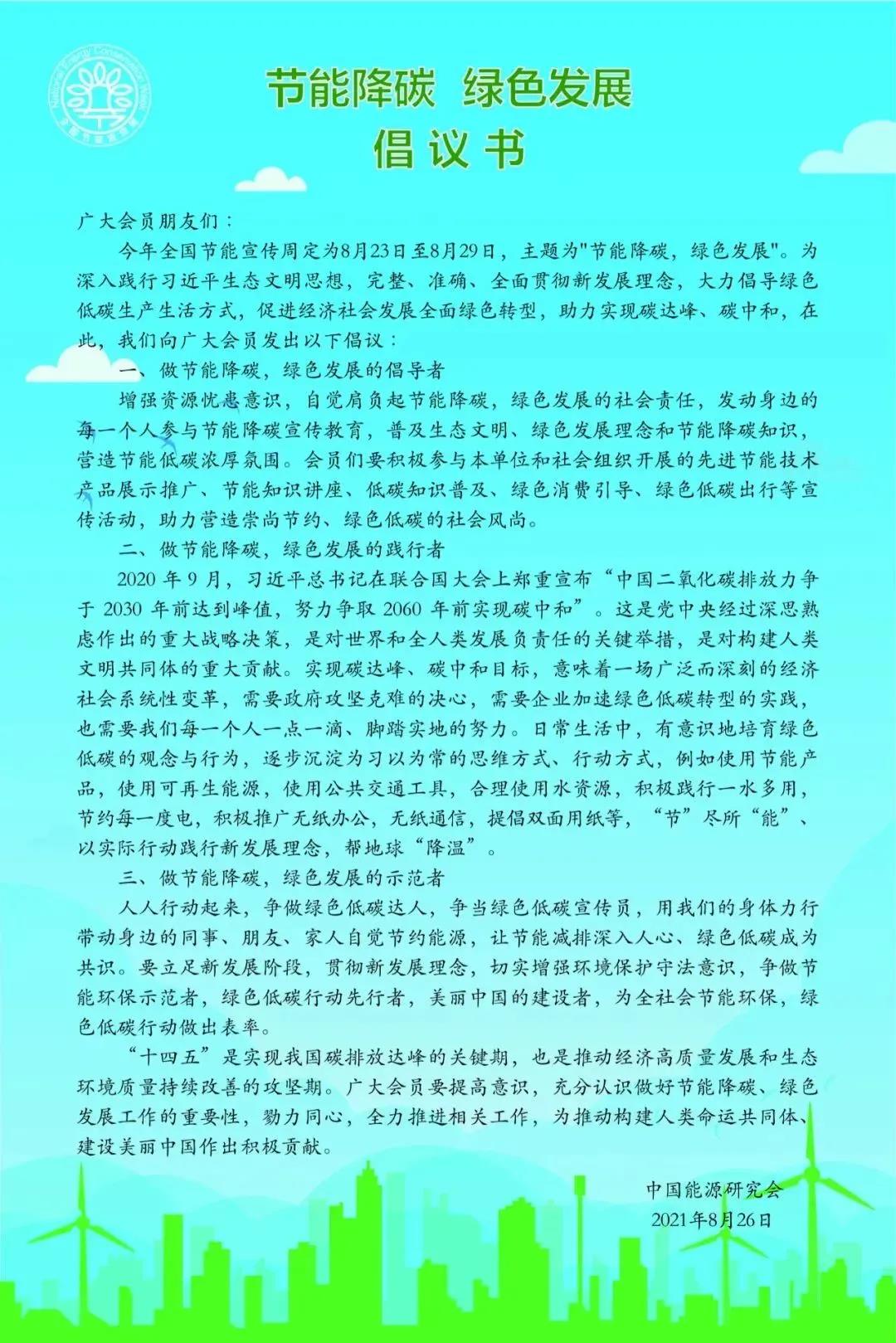 活(huo)动中,中国能源研究(jiu)会发布了“节(jie)能降(jiang)碳(tan),绿色(se)发展”倡议书,号(hao)召(zhao)广大(da)会员争做“节(jie)能降(jiang)碳(tan)、绿色(se)发展”的(de)倡导者、践行者和示范者,为建(jian)设美(mei)丽中国作出积极(ji)贡献。